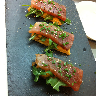 Atum cortado transversalmente às lascas com a forma pretendida, e marinado brevemente em molho de soja, aqui com atenção para não usar muito molho, umas gotinhas bastam, por vários motivos: